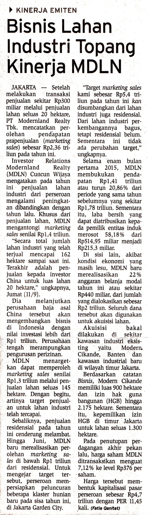 Bisnis Lahan Industri Topang Kinerja MDLN