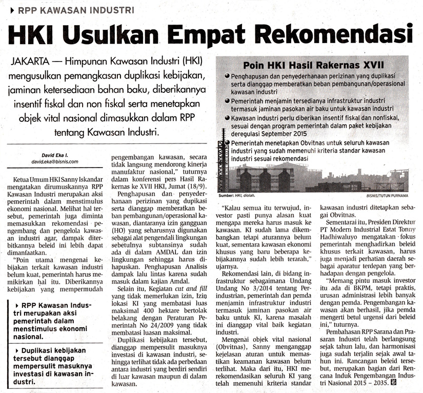 JAKARTA-Himpunan Kawasan Industri (HKI) mengusulkan pemangkasan duplikasi kebijakan, jaminan ketersediaan bahan baku, diberikannya insentif fiskal dan non fiskal serta menetapkan objek vital nasional dimasukkan dalam RPPtentang Kawasan Industri.